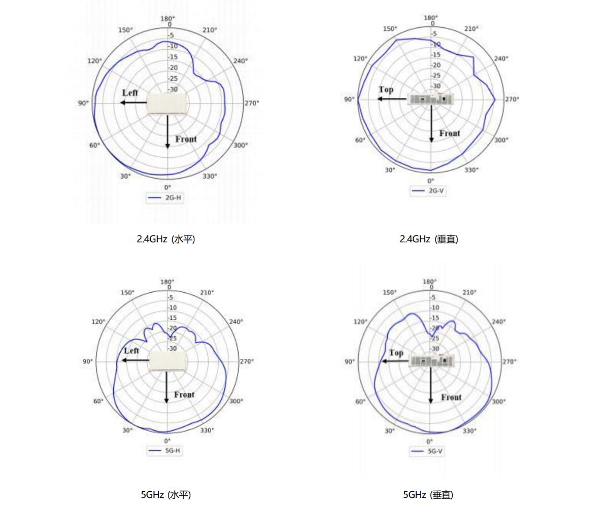 2、组合2.4GHz 或 5GHz 所有天线后,等效天线增益 :2.4GHz: 3dBi, 5GHz:3dBi。